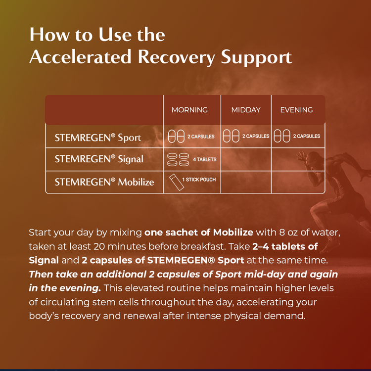 The STEMREGEN® Sport Accelerated Recovery Support is a powerful regimen crafted for athletes and high performers who need elevated, ongoing recovery support. This advanced protocol includes three bottles of STEMREGEN® Sport—formulated to boost stem cell release and migration—along with one bottle each of Signal and Mobilize to support optimal cellular signaling and stem cell transport.